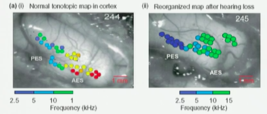 The cells in the cortex that used to respond to the now absent frequencies are not being stimulated, and actually start to respond to different frequencies → over-representation of frequencies that remain!