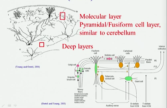 Sends signals similar to the primary auditory afferents, projects to the superior olivary complex.