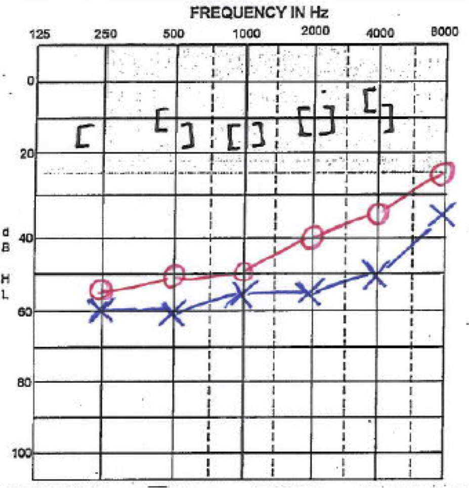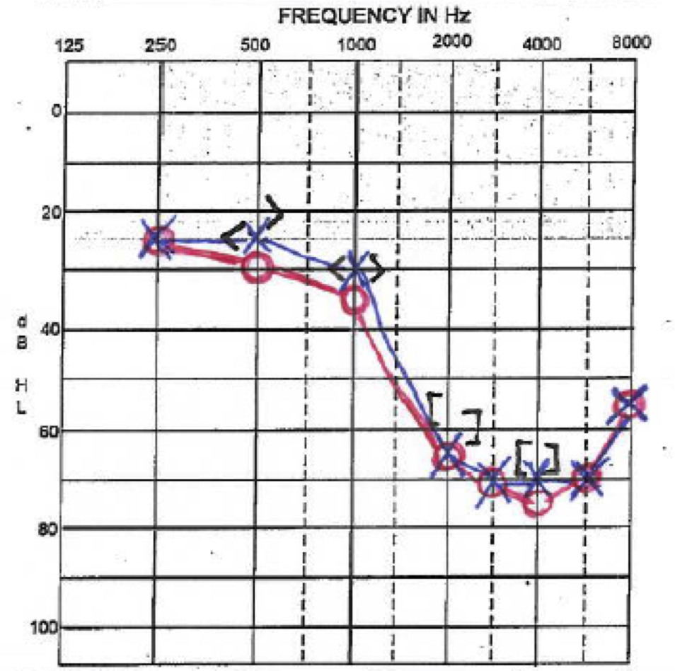 High frequency bilateral SNHL. Knotch pattern in high freq is indicative of long-term noise exposure wthout protection