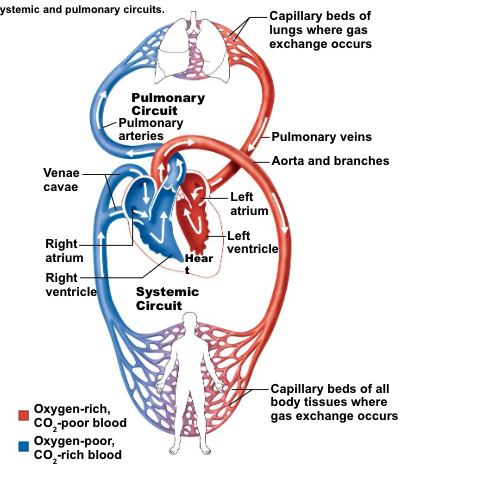 Describe blood flow in the heart. What is the pulmonary circuit? Systemic?