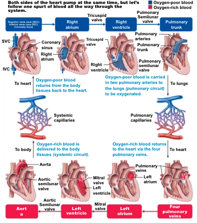 vena cava > R atrium > tricuspid valve > R ventricle > pulmonary semilunar valve > pulmonary trunk > pulmonary arteries > lungs > pulmonary veins > L atrium > mitral valve > L ventricle > aortic semilunar valve > aorta > body/systemic circulation