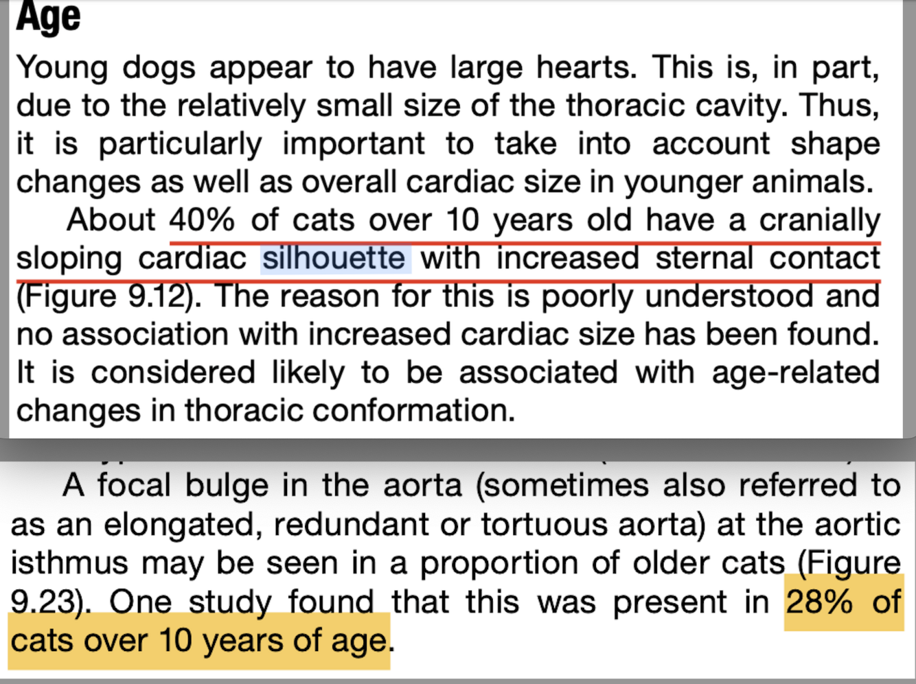 _____ percentage of cats over _____ years old have a cranially sloping cardiac silhouette, with increased sternal contact, on a lateral radiograph.