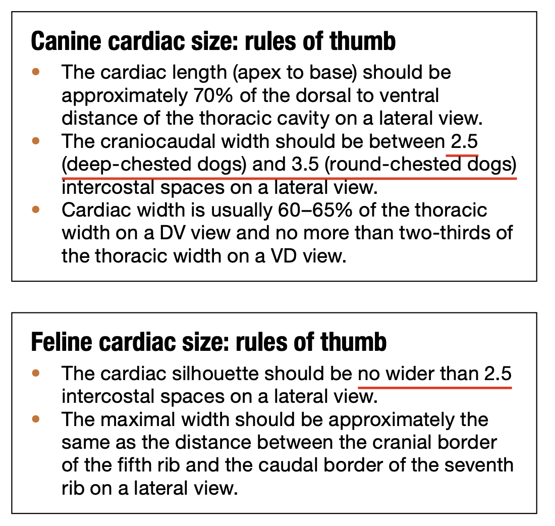 Max size (in intercostal spaces) of dog and cat hearts on lateral radiographs?