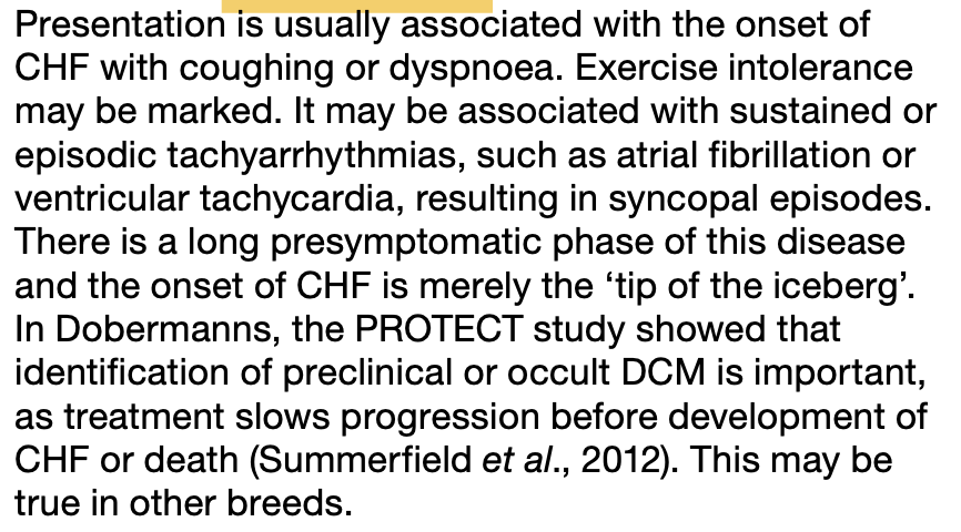 What did the PROTECT study about DCM in Dobermanns report, regarding timing of diagnosis and outcome?