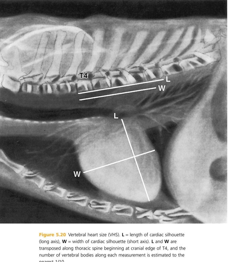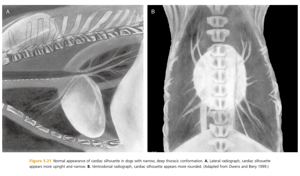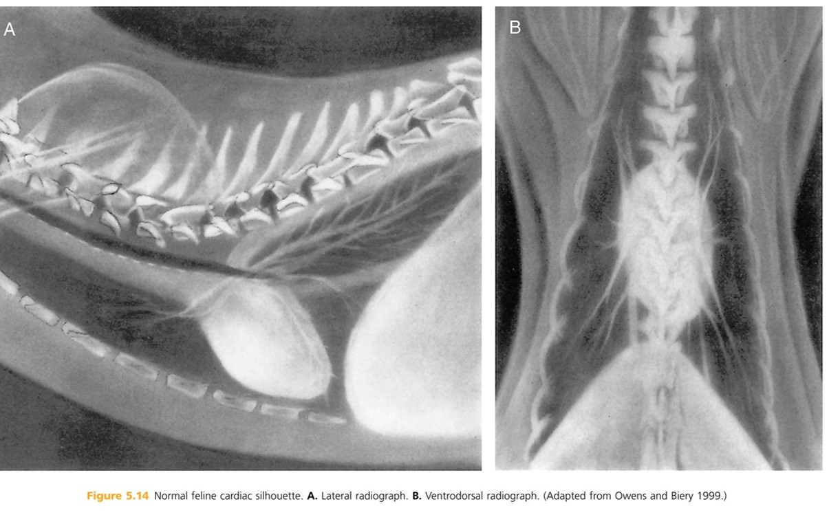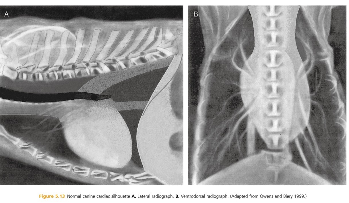Heart: The shadow is actually the pericardium and the heart should be termed the cardiac silhouette. The cardiac silhouette fills about 3/4 of the thorax in a lateral view and 2/3 in a DV/VD view. Minimal heart enlargement will be hard to determine. The heart appears as a solid globe, so the boundaries are evaluated rather than the chambers. The cardiac silhouette should be less than half the width of the VD thorax at the level of the ninth rib.