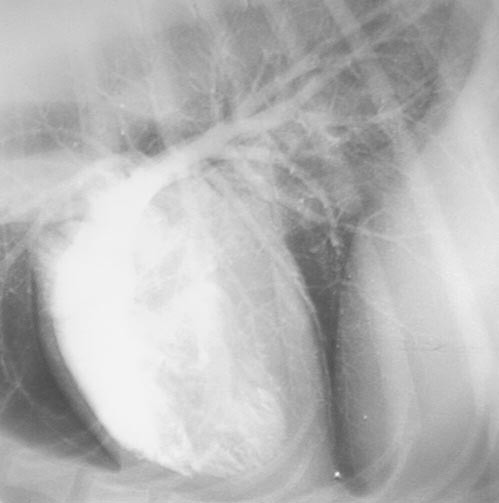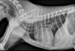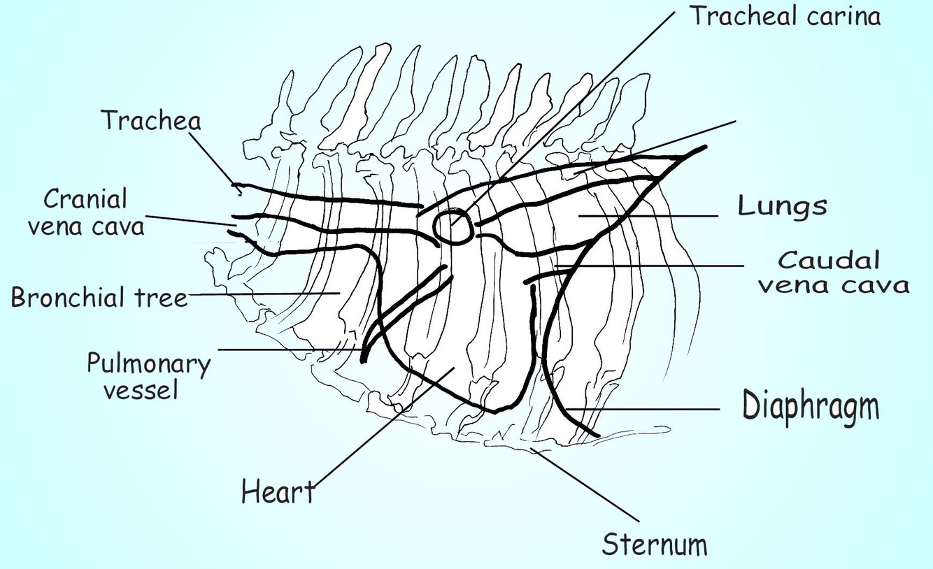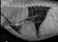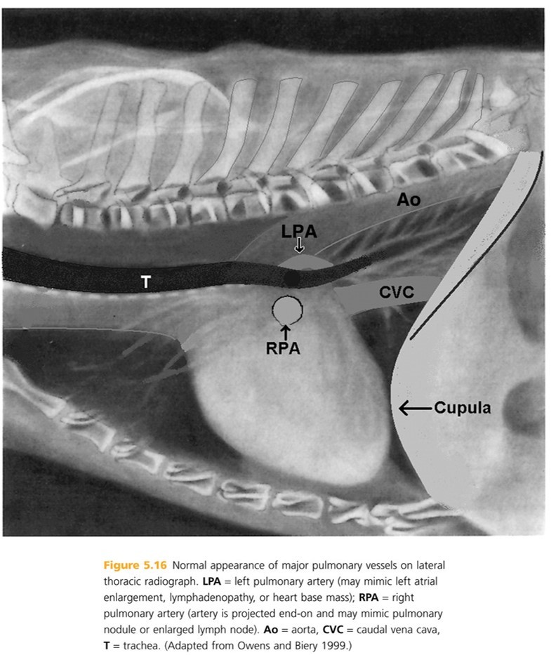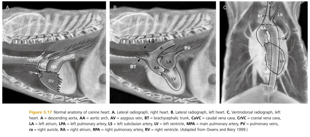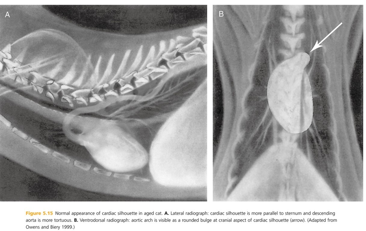 Heart: The shadow is actually the pericardium and the heart should be termed the cardiac silhouette. The cardiac silhouette fills about 3/4 of the thorax in a lateral view and 2/3 in a DV/VD view. Minimal heart enlargement will be hard to determine. The heart appears as a solid globe, so the boundaries are evaluated rather than the chambers. The cardiac silhouette should be less than half the width of the VD thorax at the level of the ninth rib.