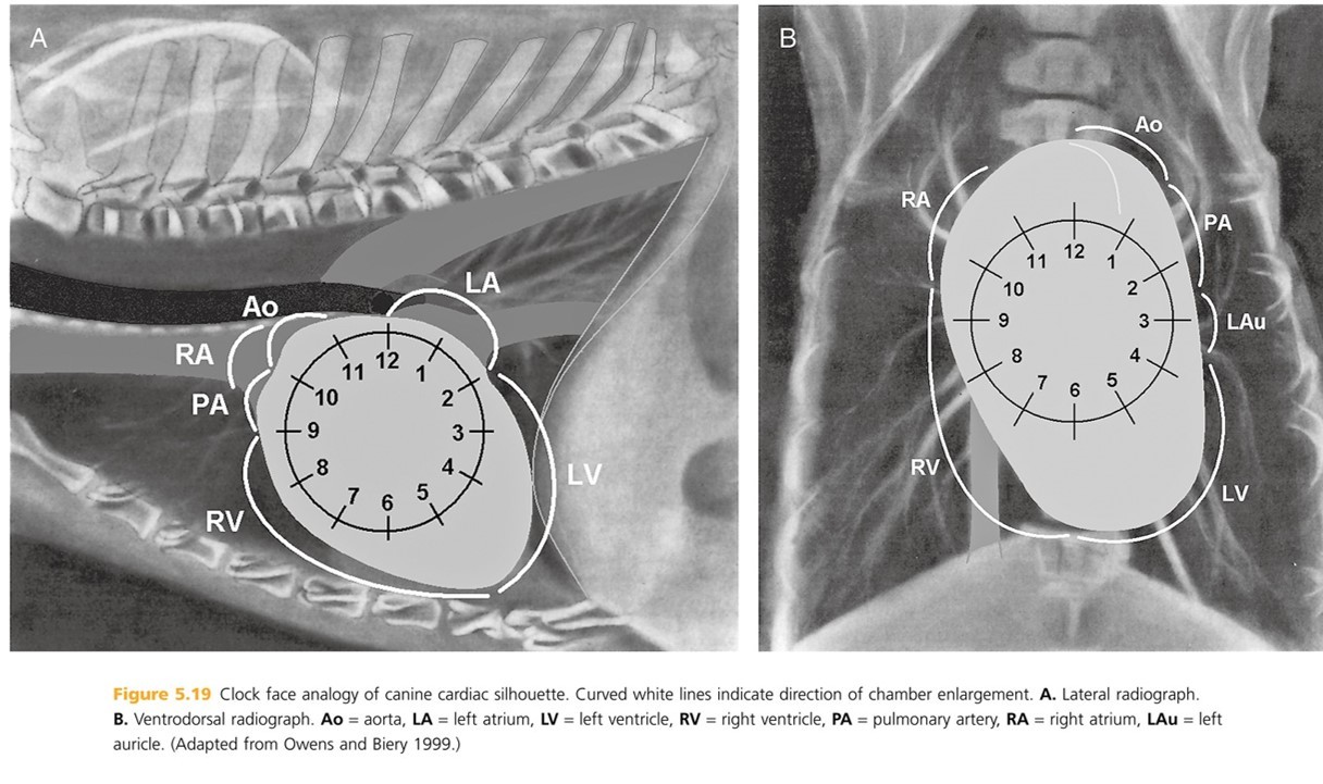 Can be imagined on a lateral view by drawing two crossing perpendicular lines. The first one follows the axis of the heart and passes from the heart base at the tracheal bifurcation through the apex. This gives a rough estimate of the location of the chambers. The clock-face analogy may be useful, but in cardiac enlargement it can be deceptive. This is because the right ventricle wraps almost completely around the left ventricle, except for the caudal side. In right heart enlargement it can even project caudal to the left ventricle. However the analogy is still useful in a 3D interpretation of the radiographs of a normal heart. The locations of the pulmonary trunk, aortic arch, apex and left auricle are important.