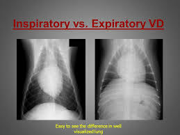 During expiration, caridac silhouette appears larger in relation to size of thoracic cavity (increased cardiac-to-thoracic ratio), with greater sternal contact and more dorsal positioning of the trachea.