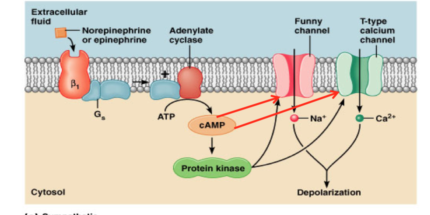 Sympathetic stimulation releases norepinephrine and initiates a cyclic AMP 2nd-messenger system which binds to If channels so they remain open longer. More rapid ion entry speeds up rate of the pacemaker depolarization causing cell to reach threshold faster leading to rate of AP