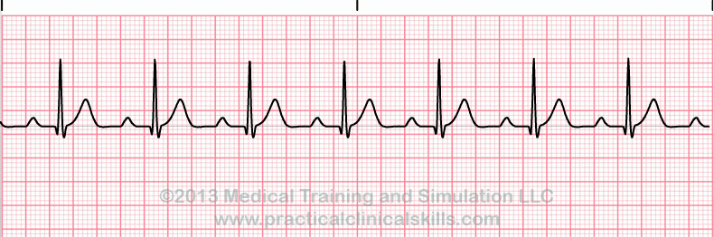 progressively prolonged PR interval, culminating in a P wave that is not followed by a QRS complex