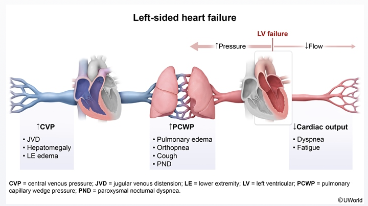 Left-heart problems cause a backup of pressure onto the pulmonary circulation, leading to increased pulmonary capillary hydrostatic pressure, thus, transudation of fluid into the alveolar spaces (pulmonary edema). Sometimes this can also cause pleural effusion, therefore these patients usually benefit from diuresis or fluid restriction. Right sided heart Cath with indicate increase pulmonary capillary wedge pressure for left sided heart failure. Exertional dyspnea, orthopnea, paroxysmal nocturnal dyspnea, jugular venous distension, and peripheral edema often presents together when right and left sided heart failure occurs (CHF).