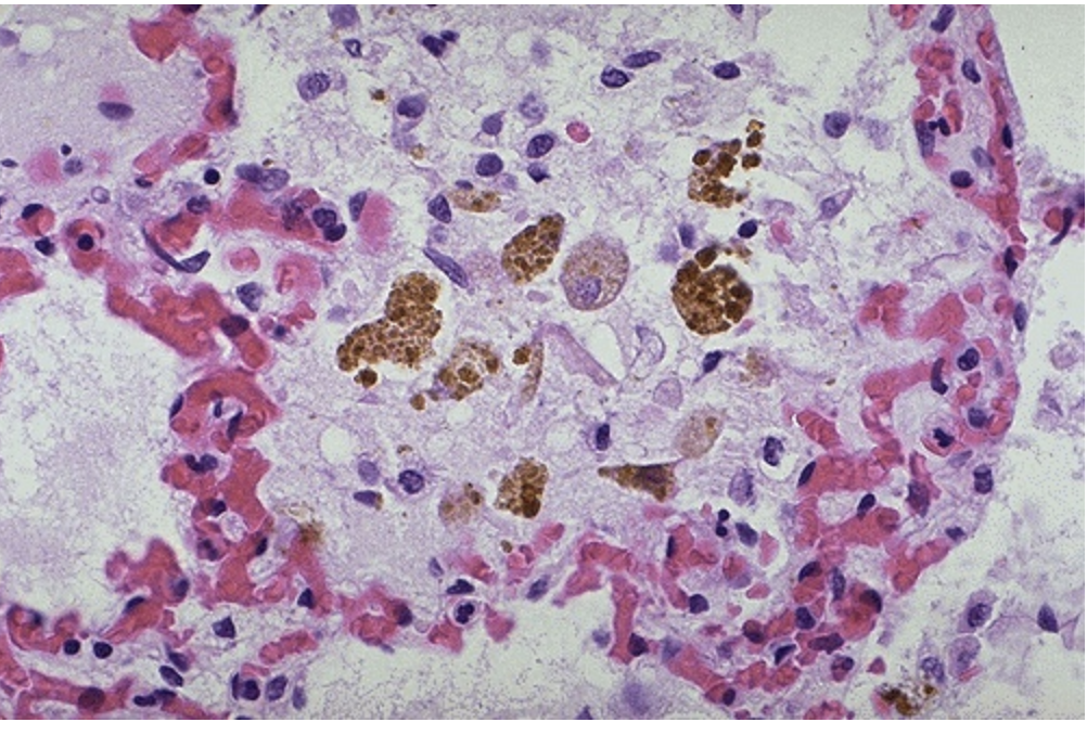 These macrophages are sometimes called “heart failure cells” because of their association with pulmonary congestion with congestive heart failure. Pulmonary congestion with dilated capillaries and leakage of blood into alveolar spaces leads to an increase in hemosiderin-laden macrophages. The brown granules of hemosiderin from breakdown of RBCs.