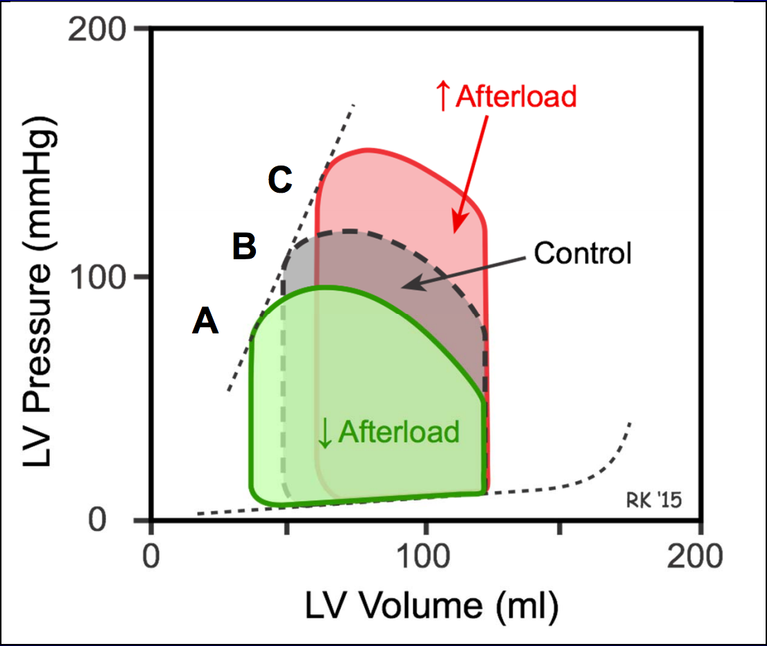 WIth increases in afterload (with no change in preload or contractility), stroke volume decreases due to increased systemic vascular resistance. While the EDV doesn’t change, more ventricular work is needed to overcome the afterload, and as a result, less fiber shortening takes place. This results in an increased ESV. The ESPVR line slope doesn’t change; however, it goes up inearly as afterload increases because at the fully contracted state from control, think of it as more volume being added (increase in ESV) and the pressure that results (End systolic pressure).