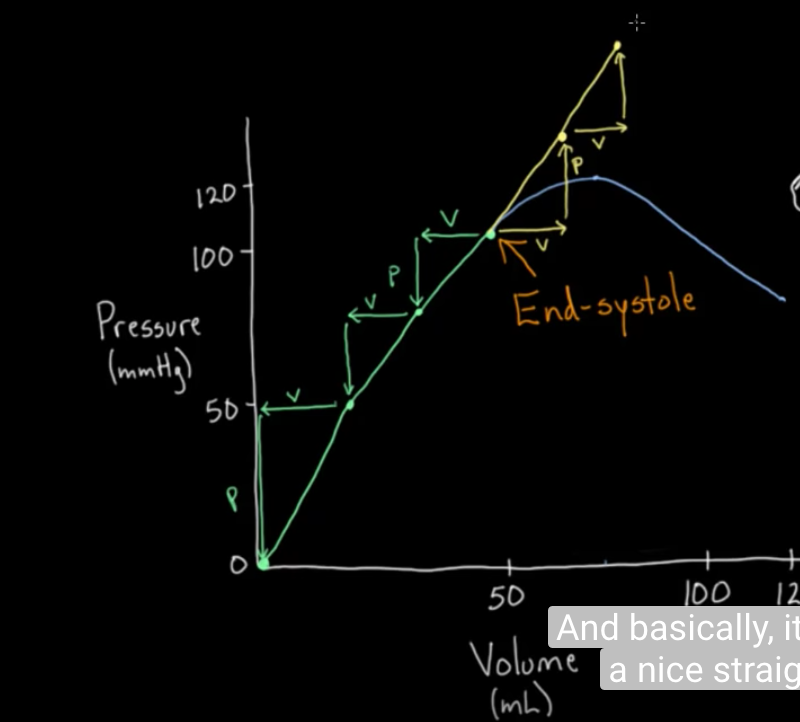 It is the straight line that tells the relationship between pressure and volume when all the muscle fibers have completely contracted (at the end of systole). It tells you what will happen to the pressure when volume is added or subtracted from a contracted myocardial cell. This essentially tells you elastance, which is P/V.