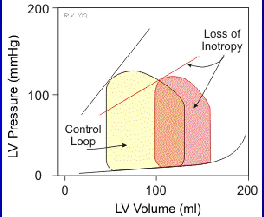 The ESPVR line (dependent on contractility) slope decreases. As a result, there is an increased ESV. When blood from pulmonary venous system returns to the LV, it adds onto the increased ESV left from systole, which increases preload. This shifts the whole P-V loop to the right. While there is a compensatory increase in SV due to increase in preload, overall SV and EF goes down.