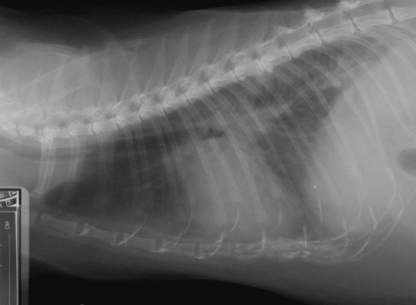 Increased opacity in dorsal caudal lung fields – interstitial pattern.
