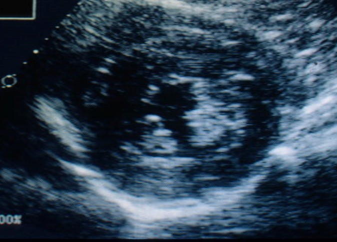 view of the L ventricle shows a thick LV free wall and a thick interventricular septum with a small ventricular lumen