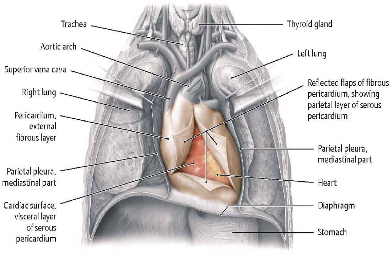If the serous pericardial membranes become inflamed (pericarditis), they become rough and no longer slide easily over one another. Pericarditis can be very painful due to the presence of pain fibers in the fibrous and parietal pericardium (There are no pain fibers in visceral pericardium).