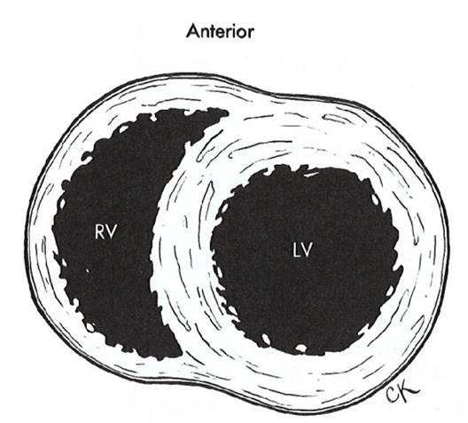 Describe the ratio of the atrial wall to the right ventricular wall to the left ventricular wall.