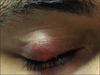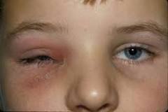 -Acute onset of erythematous swollen eyelid with proptosis (bulging of the eyeball) and pain in affected eye.