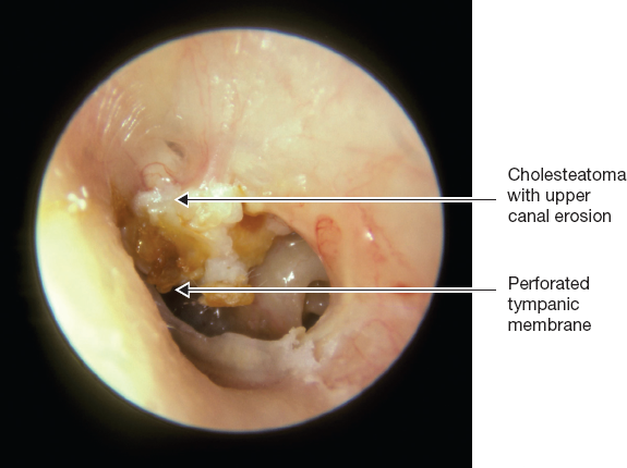 -1. perforation of the tympanic membrane (TM) on the superior quadrant and a cauliflower-like or pearly-white mass (Figure 1).