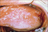 -White-to-light-gray patch that appears on tongue, floor of mouth, or inside cheek.