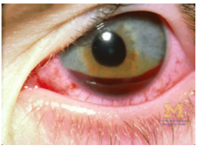 hypema -is a rupture or iris or ciliary body, could be caused by trama or bleeding disorderd.