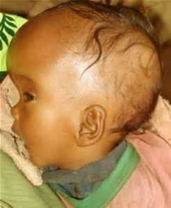 Hydrocephalus; buildup of CSF in ventricles