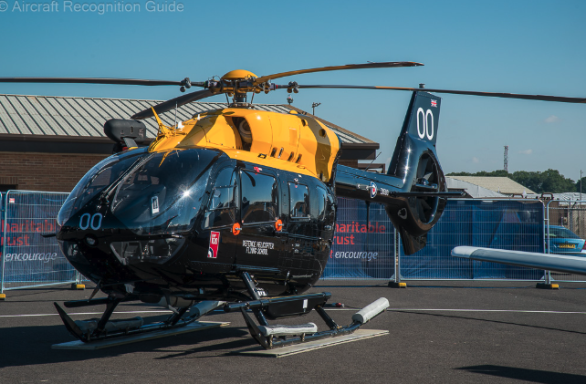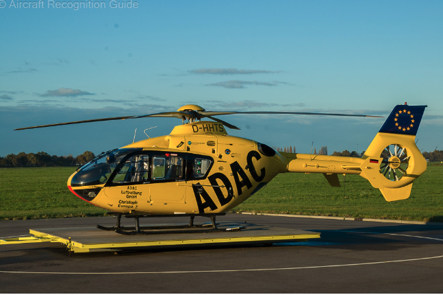 The EC135/H135 has two engines, with air intakes and exhausts in the top of and flush with the streamlined fuselage. Furthermore, the EC135 has a ‘standard’ tube skids, a four blade main rotor and a small gear box hub.