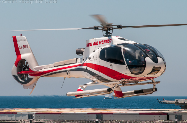 Essentially the EC130 is an EC120 with a wider cabin, visible at the front, with a wider and longer middle front window, and an additional square window at the bottom. The vertical stabiliser of the EC130 is low and ventral fin almost non existent. Finally, the exhaust is curved, but centered with respect to the tail boom.