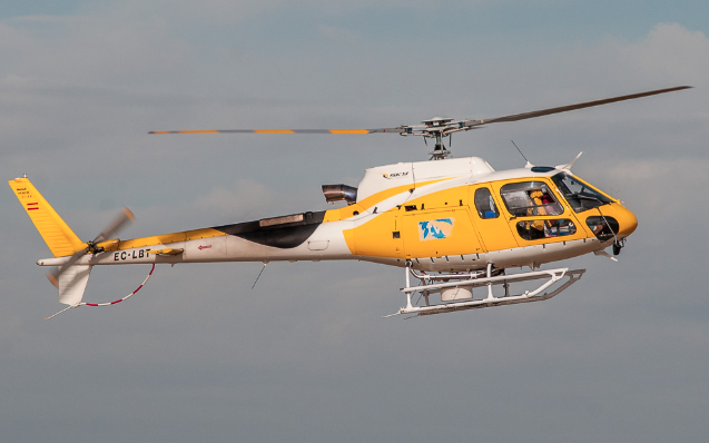 The Écureuil is one of the most common helicopters. It comes in single and twin engine versions. Characteristic are the narrow tail boom with the tail rotor drive shaft on top, curved underside of the fuselage and the cabin window pattern, especially the windows at the feet of the crew.