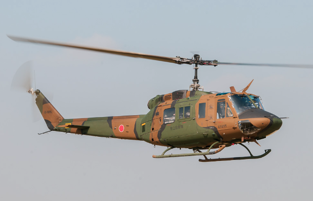 The famous Bell UH-1 Huey family consists of many members, but all with a similar fuselage and tail, and all with skids. Most have a two blade main rotor on a long axis, and a two blade tail rotor at the top of the vertical stabiliser. The Bell 412 variants have a four blade main rotor though. At about a third from the end of the tail boom there are horizontal stabilisers on both sides.