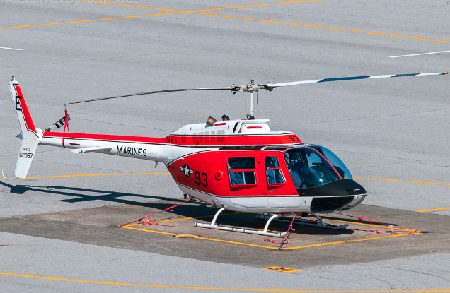 The window arrangement with the two large curved front windows and large ‘feet’ windows is a typical feature of the Bell 206 family, as is the long visible rotor mast, with the control rods next to it. Another characteristic is the pointed bent in the rear fuselage. It comes in versions with two or four main rotor blades.
