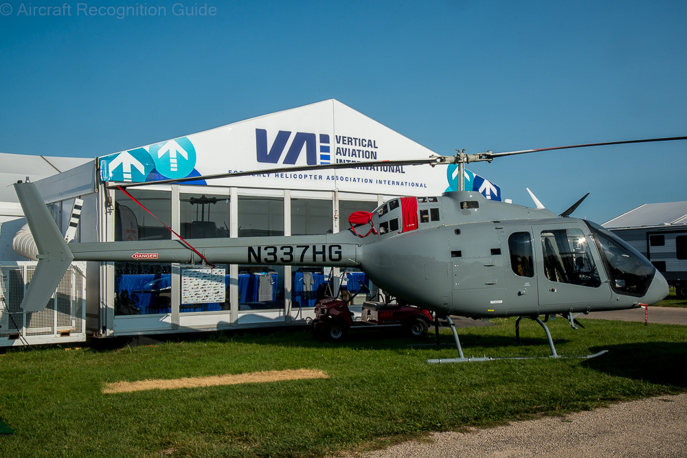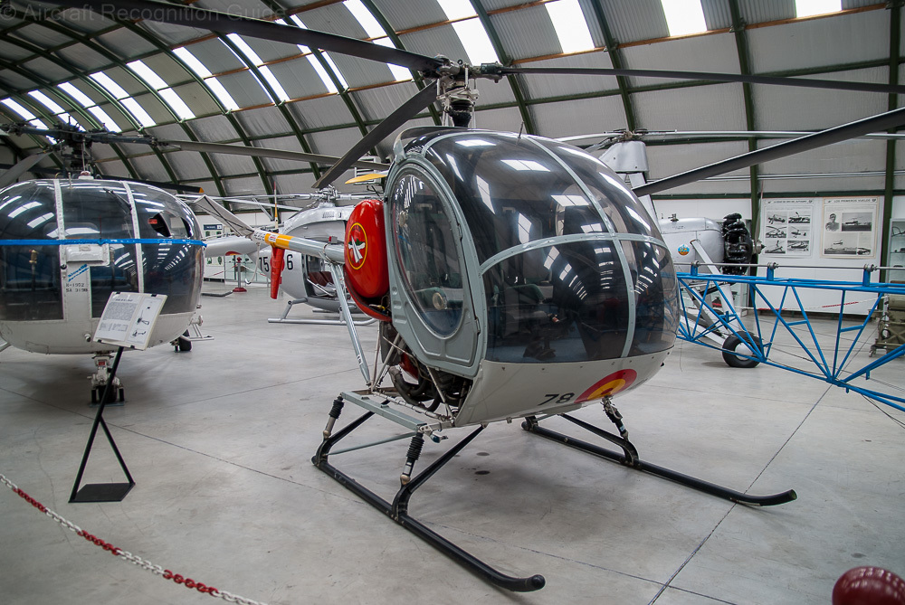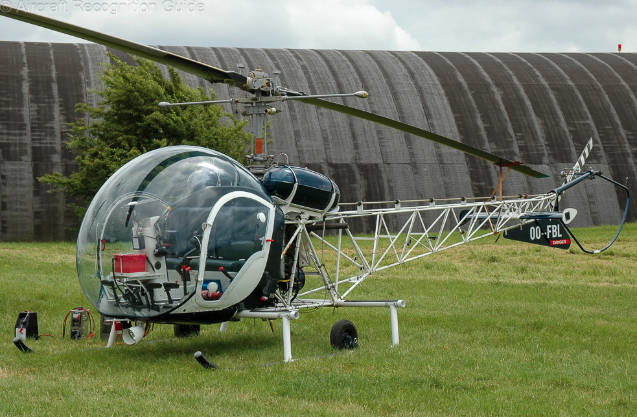The large bubble canopy and the open frame tail boom are very distinctive recognition points of this helicopter. This version has a two blade main and tail rotor. It comes in different versions though, including ones with a covered tail boom and/or a wheeled gear.