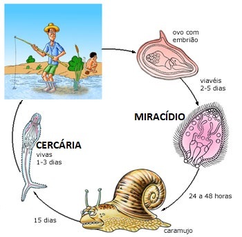Ovo→ Miracídio na água→ Caramujo→ Cercária→ Pele→ Vasos mesentéricos