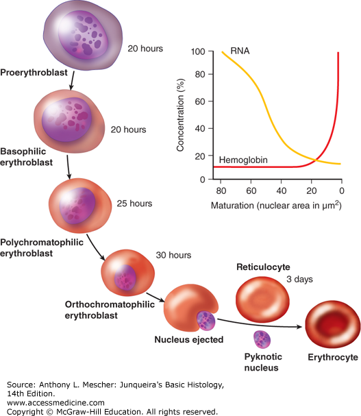 Beskriv erytropoesens 6 steg från erytroblast till erytrocyt.