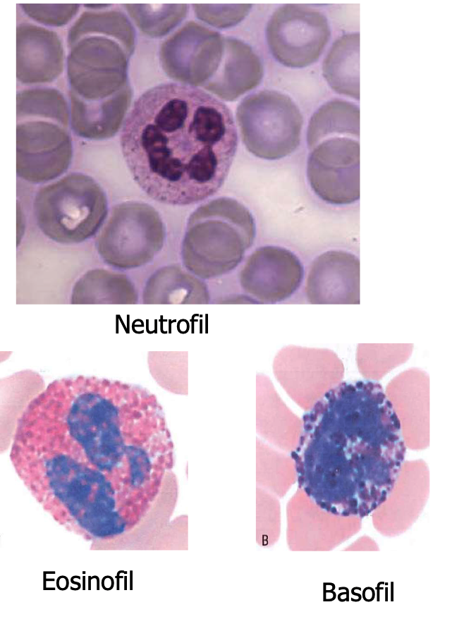 Samtliga är relativt stora, har loberad cellkärna (2-5 lober) och innehåller specifika granula med olika enzymer.