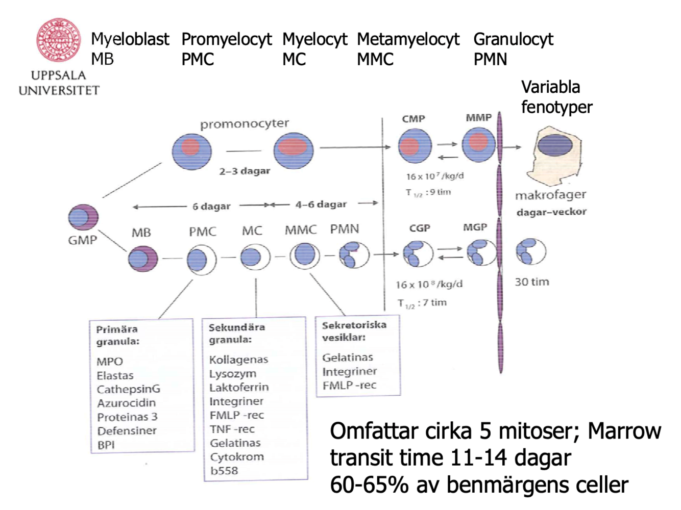 Beskriv utvecklingsstegen från myeloblast till granulocyt.