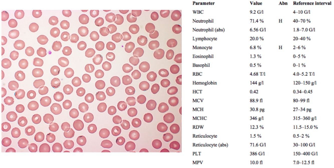 The slide image shows some RBCs with less “central pallor” (paleness) than usual, indicating a rounder, less biconcave shape.