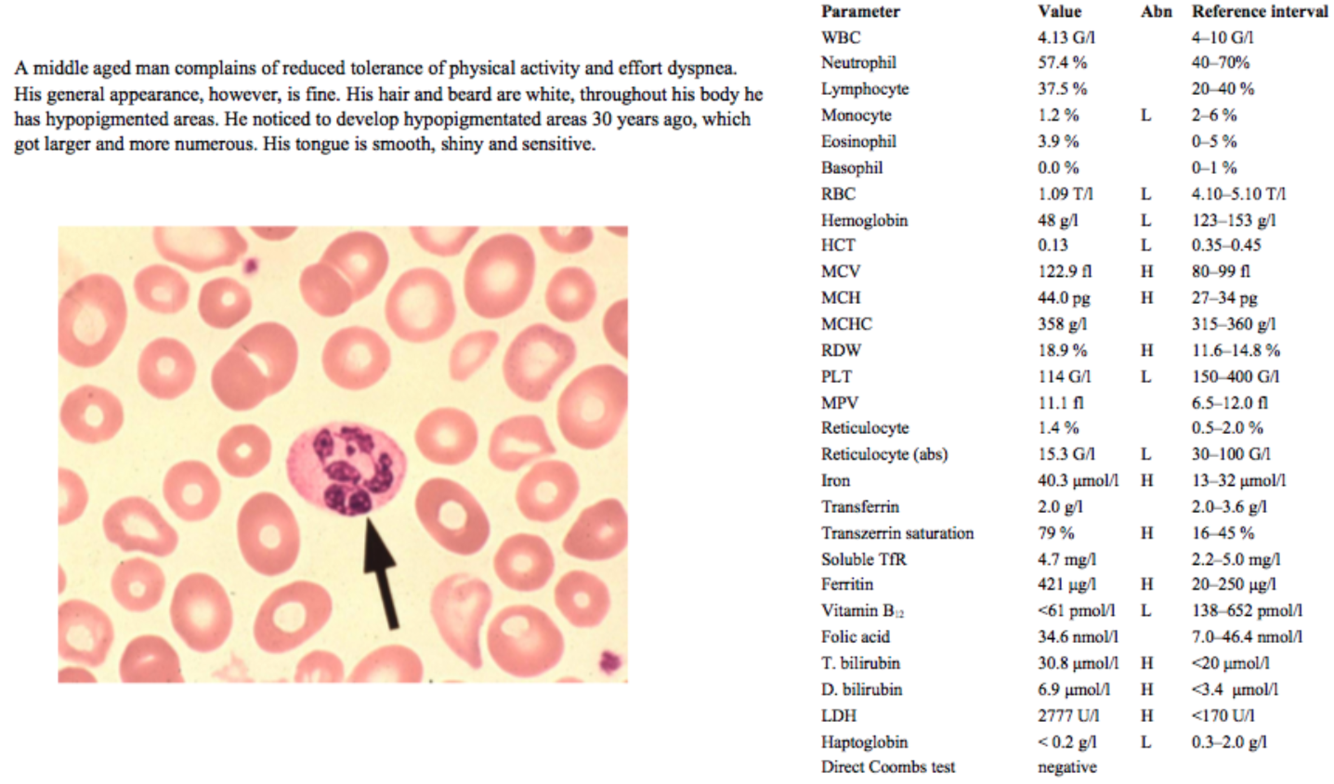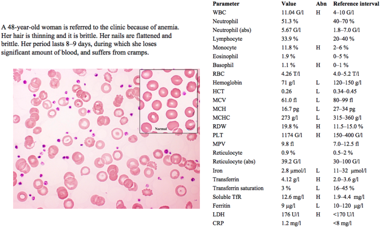 RBCs, hematocrit and hemoglobin are low, indicating some form of anemia