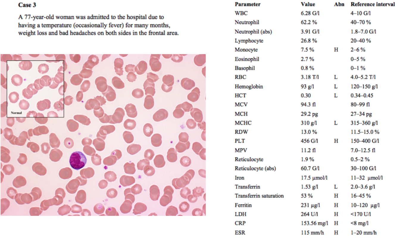 A 77-year-old woman was admitted to the hospital due to having a temperature (occasionally fever) for many months, weight loss and bad headaches on both sides in the frontal area.