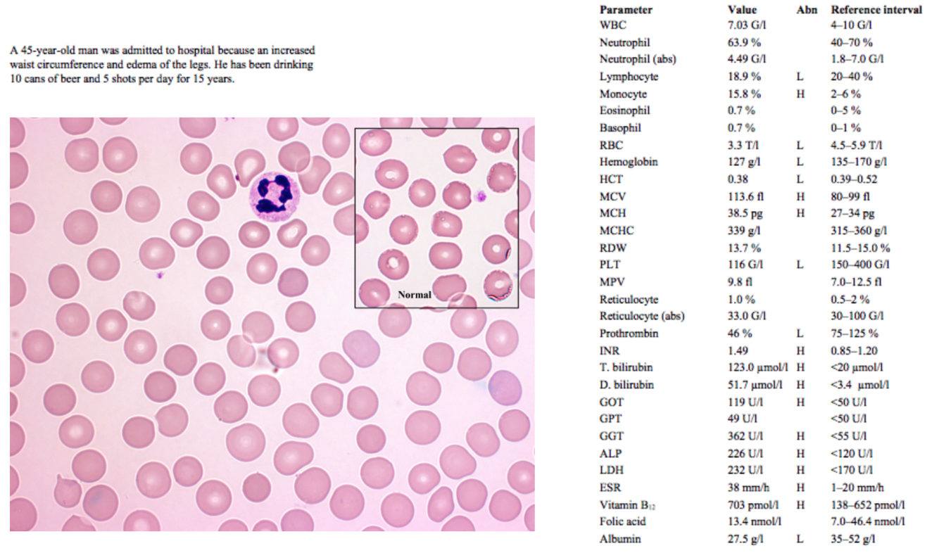 A 45-year-old man was admitted to hospital because an increased waist circumference and edema of the legs. He has been drinking 10 cans of beer and 5 shots per day for 15 years.