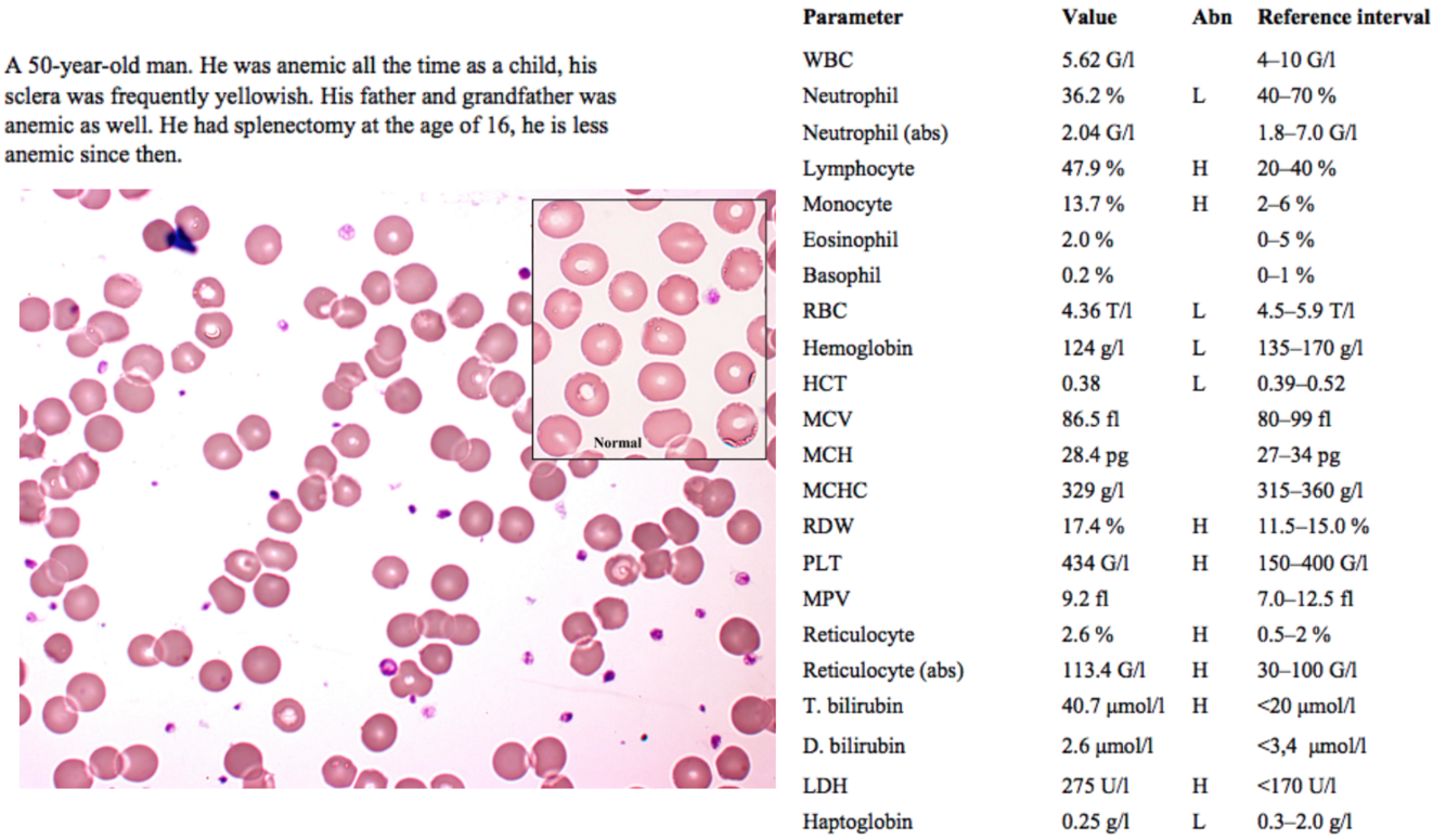 A 50-year-old man. He was anemic all the time as a child, his sclera was frequently yellowish. His father and grandfather was anemic as well. He had splenectomy at the age of 16, he is less anemic since then.