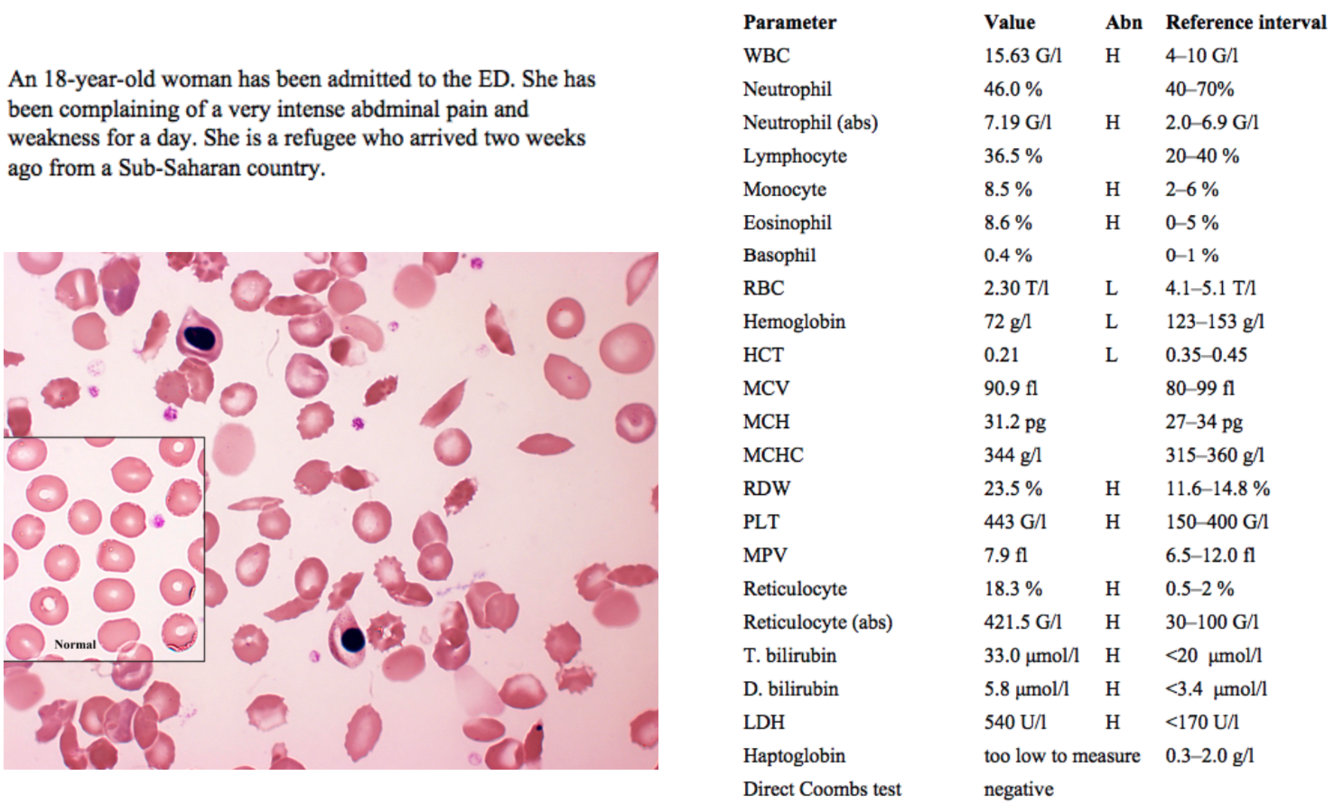 An 18-year-old woman has been admitted to the ED. She has been complaining of a very intense abdminal pain and weakness for a day. She is a refugee who arrived two weeks ago from a Sub-Saharan country.