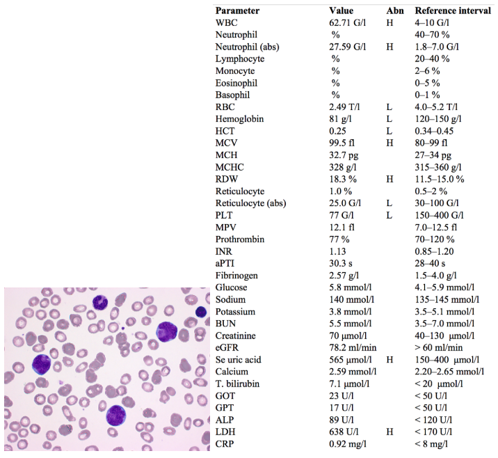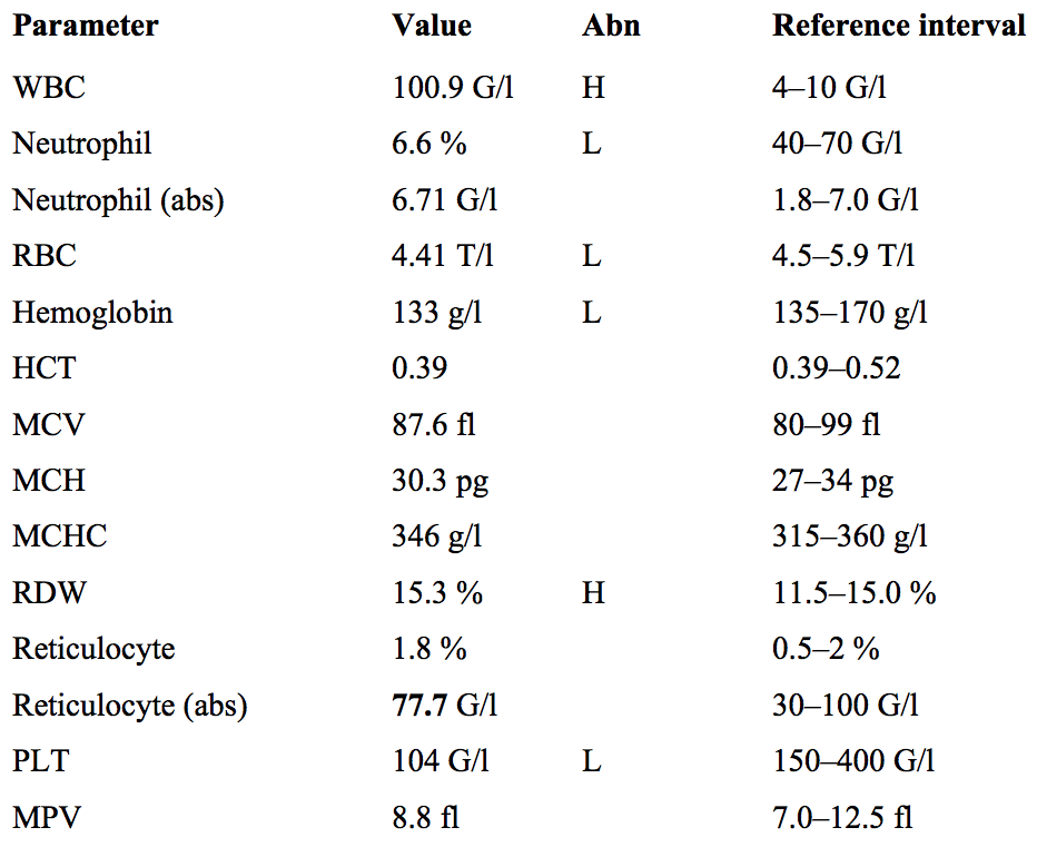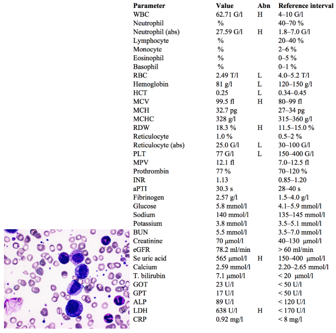 Anemia and thrombocytopenia are seen (low RBC, Hgb, Hct and platelets). These are common signs of hematological neoplasms, as overproduction of WBCs “crowds out” erythrocyte precursors and megakaryocytes from the bone marrow.