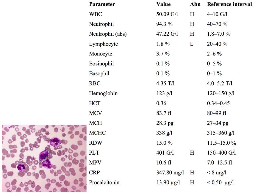 The blood smear image shows some granulocytes of unusual morphology. In bacterial infections, reactive increases in WBC production can lead to the release of granulocyte precursors into peripheral blood.