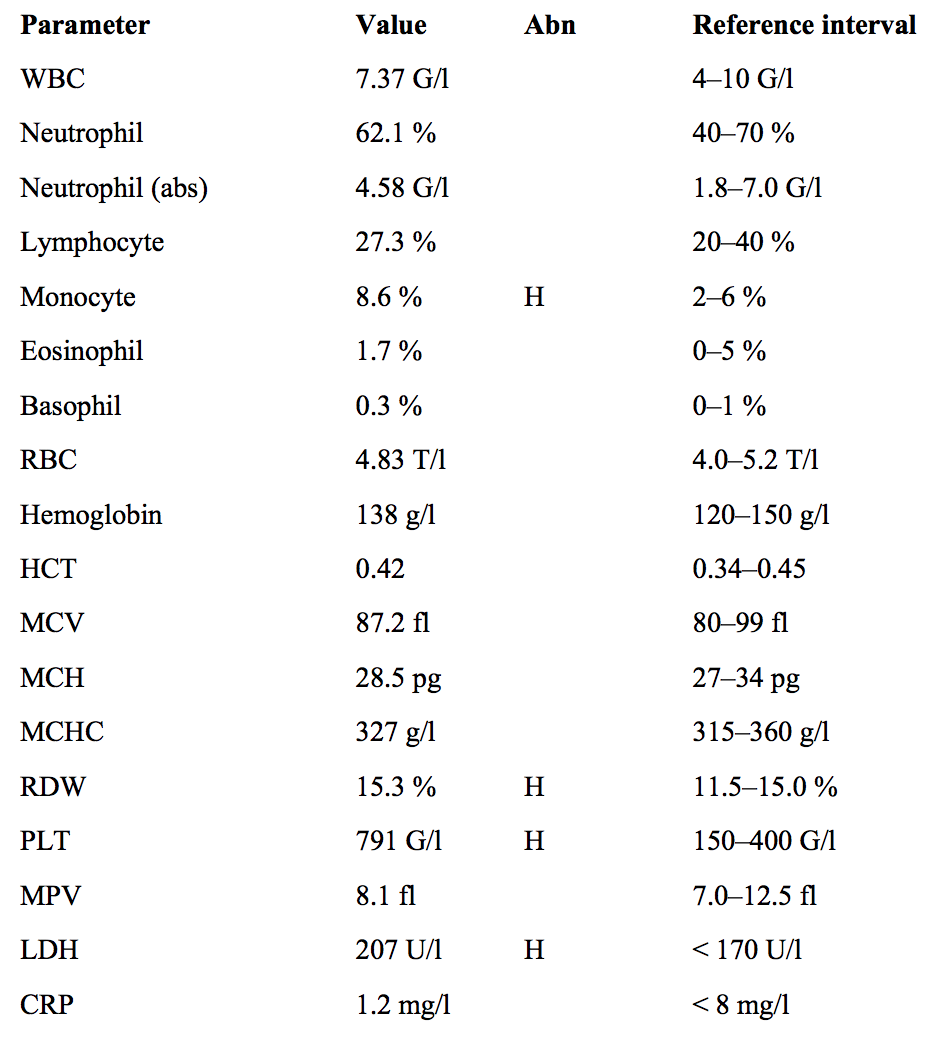Notice that the WBC differential values are missing. This is due to the presence of a high number of abnormal cells in the periphery. Microscopy of a peripheral blood smear would be helpful in the diagnosis of this case: