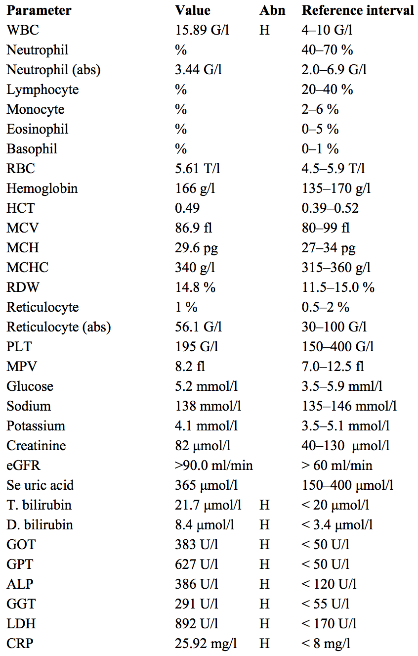 Total bilirubin is high, most of which is indirect bilirubin; as mentioned before, indirect hyperbilirubinemia is normal in cases of hemolysis, as is increased LDH