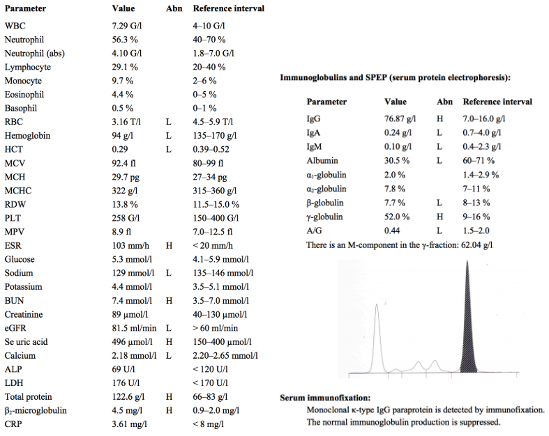 Serum Immunoglobulins and electrophoresis show the presence of high IgG, with levels of all other immunoglobulins and albumin being low. This is typical of multiple myeloma, as overproduction of a single antibody suppresses production of other serum proteins.