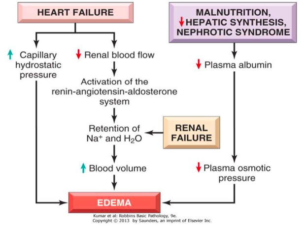 sodium and water retention increasd hydrostatic pressure (expanded intravascular volume) and decreased colloid osmotic pressure